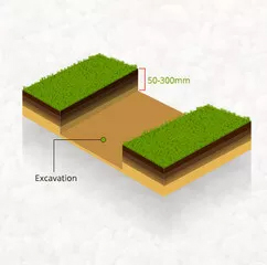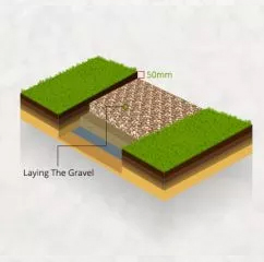 Unfortunately it is very rare that a gravel driveway construction will require no excavation. At the very least the topsoil should be removed as its load bearing ability is poor and the heavy concentration of decomposed organic material makes topsoil particularly prone to retaining water. The depth of topsoil that needs to be removed depends entirely on your area and can vary anything from 50-300mm in depth. Once the topsoil is removed you should have an exposed layer of firm subsoil. Any further digging required will be governed by the desired finished level and will vary from site to site. Any soft areas that remain after topsoil is removed need to be excavated and then filled with compacted sub-base material before the membrane is laid.
